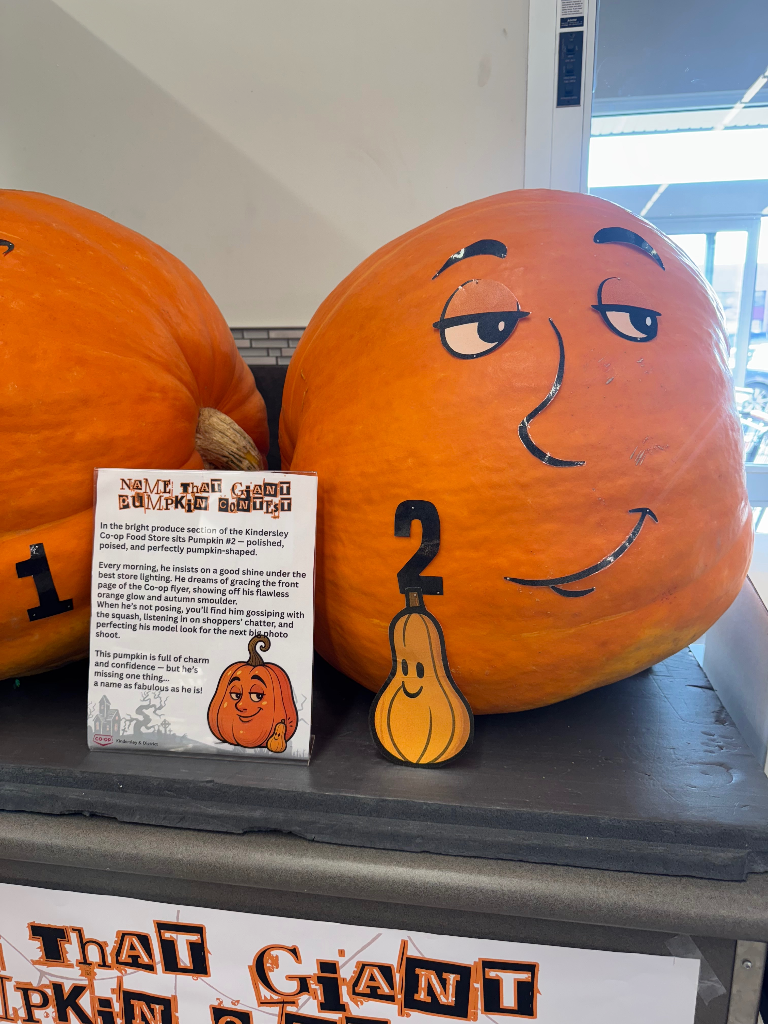 We need your help! We have two GIANT pumpkins that need names — read their stories below and submit your names in-store at the Kindersley Food Store or online via the link below!