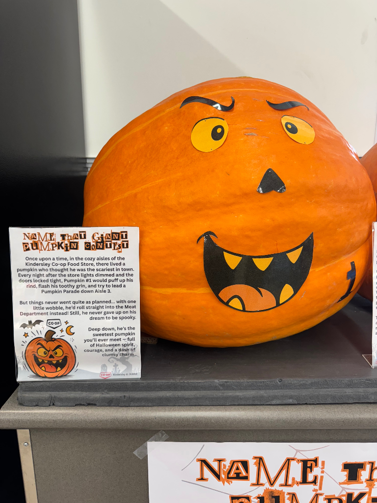 Once upon a time, in the cozy aisles of the Kindersley Co-op Food Store, there lived a pumpkin who thought he was the scariest in town. Every night after the store lights dimmed and the doors locked tight, Pumpkin #1 would puff up his rind, flash his toothy grin, and try to lead a Pumpkin Parade down Aisle 3.